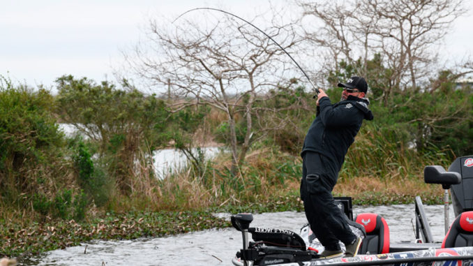 Early February usually finds Gonzales bass fishing pro Greg Hackney pulling bass off trees in waters near his hometown but he’ll concentrate this year on Toledo Bend. He likes to fish the 1215 area. (Photo courtesy strikeking.com)