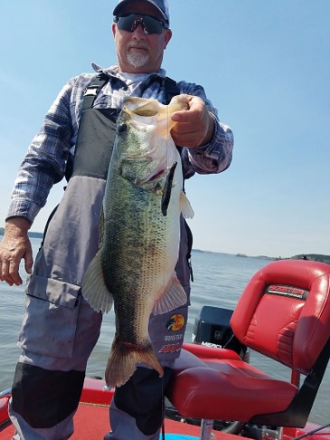 Mark Ray of Pine Bluff, Arkansas, has a firm grip on the lip of a 4-pound bass caught while fishing with John Dean at Toledo Bend. Ray was “dead sticking” a Zoom Super Fluke in 5 feet of water on a cool day, a technique that should put plenty of bass in the boat in November.