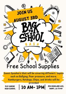 Come out to Old Sabine High School for free food, drinks and school supplies. Guest speakers will explain the workings behind bullying, how to avoid peer pressure, and more.
