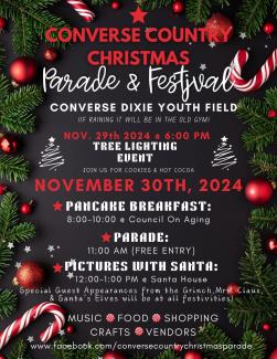 Saturday, November 30, 2024 United States Converse Dixie Youth Field (if raining will be in old gym) https://www.facebook.com/conversecountrychristmasparade Bring your family and friends out November 30th to spend the day with Santa and doing Christmas shopping!