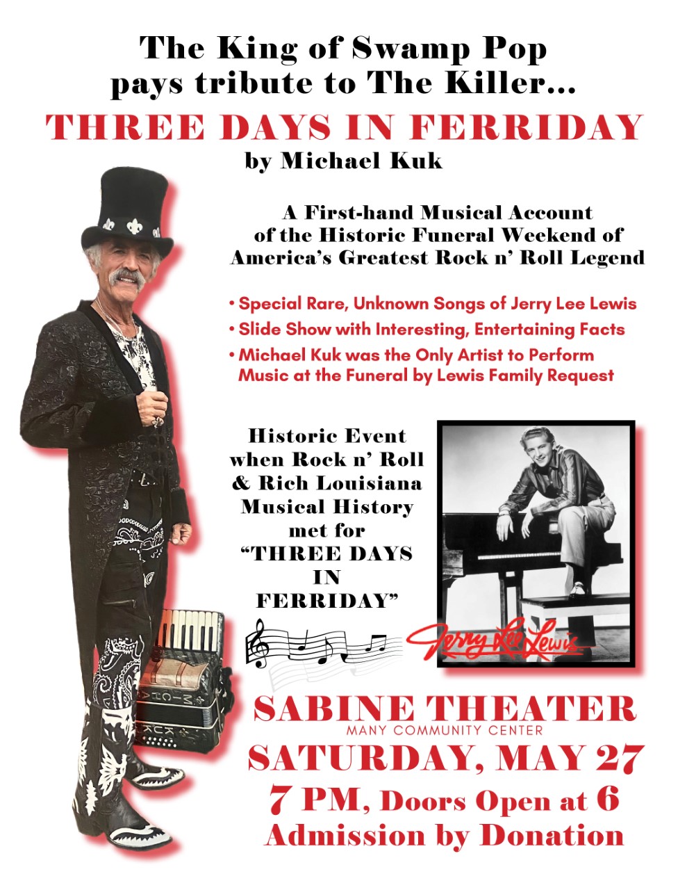 A Jerry Lee Lewis tribute is coming to Sabine Parish by "Three Days in Ferriday." All of the public is invited to attend, admission fees are by donation only. The unique storytelling of events surrounding the Rock and Roll Hall of Famer, Jerry Lee Lewis, will be presented by Michael Kuk, the King of Swamp Pop and Chief of the Keyboards. Kuk is a proud native of Western Louisiana. The presentation will recount his first-hand experience of the historical weekend surrounding the visitation and final solemn honors rendered to the musical legend in his hometown through a slideshow, detailed dialogue, and music. Kuk will be playing rare and unknown songs of 'The Killer' toward the end of the program, concluding with a solemn but beautiful arrangement of 'Amazing Grace', that he played as Jerry Lee Lewis crossed the threshold of the funeral home's chapel and was carried to his burial in a snow-white hearse. Kuk's performance was the only live music performed during the funeral by special request of the Lewis family, and he is coming to share the experience with all of you. You are invited to come and be part of this once-in-a-lifetime event highlighting Louisiana's musical history and pay tribute to Louisiana's legendary Jerry Lee Lewis.