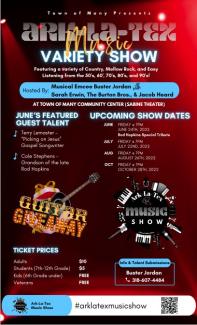 The Ark-La-Tex Music Show at the Sabine Theater (Many Community Center) on Friday, July 22nd at 7 pm. Featuring a variety of music and local talent, you will be sure to enjoy - a variety of Country, Mellow Rock, and Easy Listening from the 50's, 60', 70's, 80's, and 90's!!  The "House Band", featuring our favorite Musical Emcee, Buster Jordan, along with Sarah Erwin and The Burton Brothers will be sure to entertain everyone.