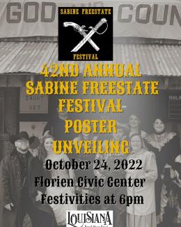 Monday, October 24, 2022 Florien Civic Center Florien, LA 71429 United States Come out and join us for an evening full of fun and excitement as we unveil the poster for the 42nd Annual Sabine Freestate Festival