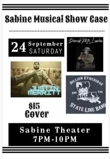 Sabine Musical Show Case, Saturday, September 24th, 7:00 pm-10:00 pm, Many Community Center. $15.00 cover charge.
