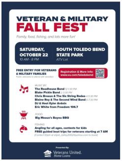 Fishing, food, and live music. Come out and enjoy this family friendly atmosphere. Veterans and military families enter free. The public is welcome to enter the site by donation. For more information please contact Elijah at elijah_talley@yahoo.com