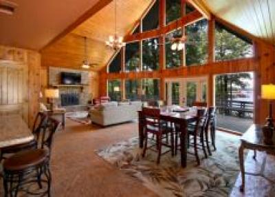 This Lakeside Home offers great amenities along with a large, beautifully furnished house with wonderful lake and woodsy views. Enjoy the covered patio or huge open lake-facing deck - fish off the lighted pier - try the paddle boat - or do a Bar-B-Q with some of the fish you catch. Great for a large family or small group with plenty of yard space and paved parking. No Smoking Indoors - No Pets 3 Bedrooms, 3 Baths, Sleeps 9, 4 Queen Beds, 1 Twin bed, Fishing Pier / Dock, Boat Slip in Boathouse, Fish Cleaning Sink & Freezer in Boathouse, Cable TV, Internet, Charcoal BBQ, Fire Pit in Yard, Paddle Boat