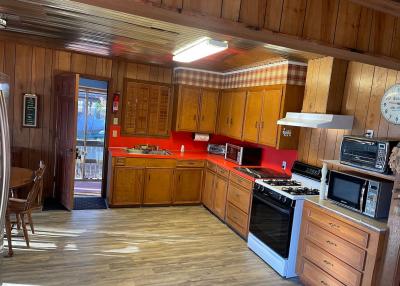 - full kitchen, including gas oven and stove top, microwave, toaster oven, pots, pans, plates, silverware, oil, salt, pepper, Tony’s and Refrigerator/freezer
