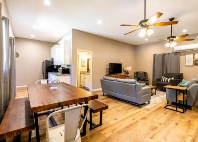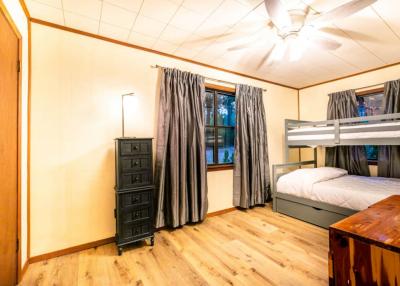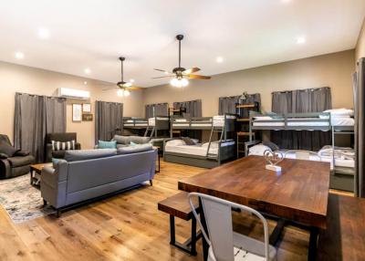 Take the pathway, on the side of the main home, which leads to the bunkhouse…. The bunkhouse studio sleeps up to 9 people and includes a full bathroom with bathtub/shower. There are 3 twin over full bunk beds. The bunkhouse also has a kitchen, with a full size refrigerator, induction cooktop, microwave, and toaster oven. There is a dining room for 6 and a spacious living area to accommodate all in the bunkhouse. The living area TV with DirecTV, WiFi access. This space is perfect for all the kids or the whole crew. Just take the pathway to get back to the main house!