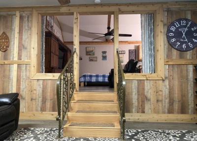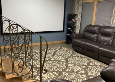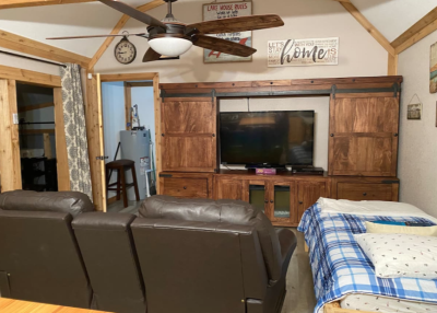 Kick back and relax in this peaceful little cabin on the lake. Watch the sunset on the patio. Everyone loves our media room with a 120 inch screen and projector. It's like having your own theater!