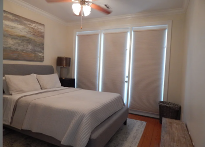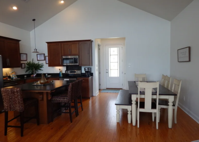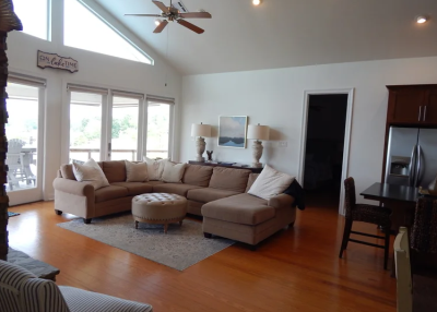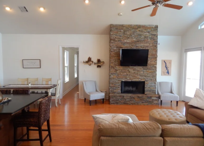Sleeps up to 8 people. Beds: The master bedroom has a queen bed, 2nd bedroom has a queen bed, and the 3rd bedroom has 2 sets of bunks. TV wireless internet and a propane BBQ pit are available for use. Private boat dock.