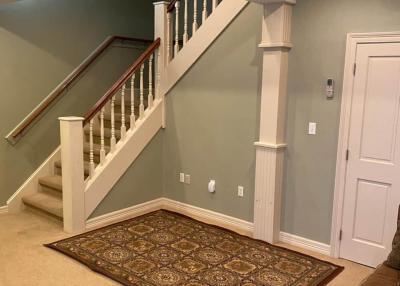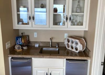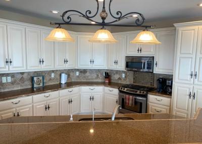 The modern, attractive kitchen makes meal preparation easy and fun! The large granite bar with 3 stools provides extra seating. The kitchen has granite counter tops, decorative stone back-splash, and pendant lights over the counter.