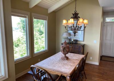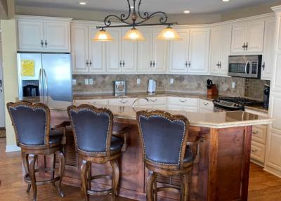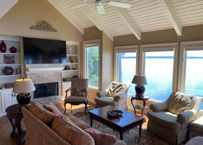 The living area definitely has the “Wow” factor! Luxurious furnishings include soft and comfortable sofas and oversized chairs, a sectional sofa and a stylish game table. Additional seating is provided at the bar and dining area. The kitchen and seating at the counter also have a great view of the lake.
